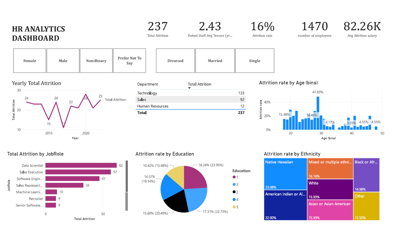 Explored attrition by age, gender, education, ethnicity, department, and role.